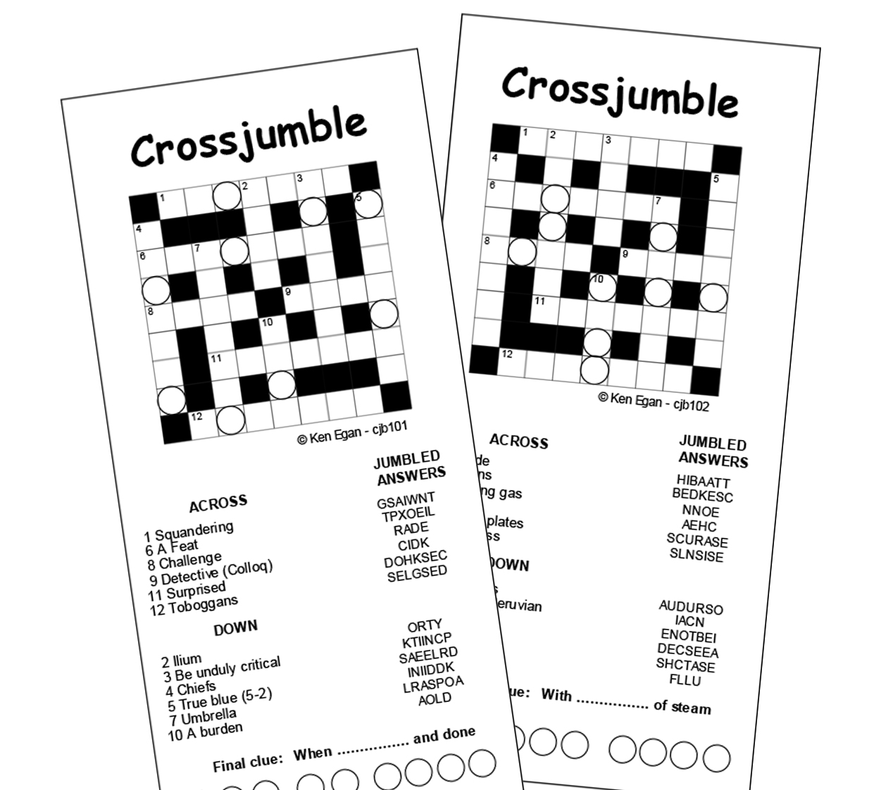 Crossjumble puzzle. This 11 page booklet includes 20 Crossjumble puzzles with solutions for printing on your personal printer.
